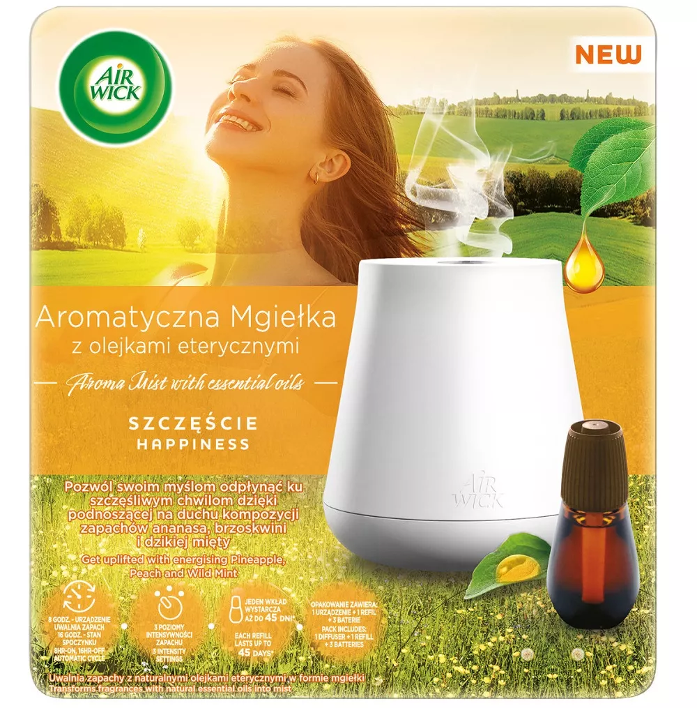 Pozwól swoim myślom odpłynąć ku szczęśliwym chwilom dzięki kompozycji zapachów ananasa, brzoskwini i dzikiej mięty. Air Wick Essential Mist Aroma to wyjątkowy odświeżacz powietrza inspirowany aromaterapią, który wprawia w dobry nastrój i zapewnia zmysłom ukojenie.
