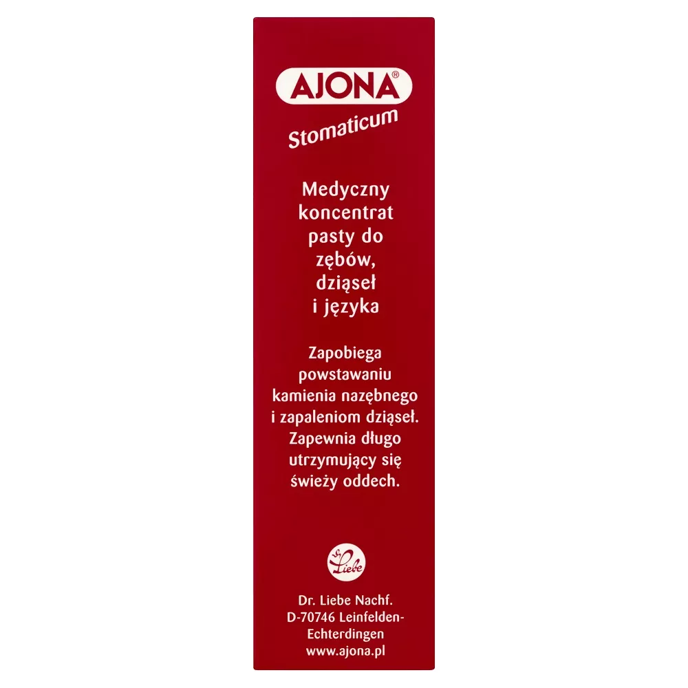 Ajona Stomaticum to medyczny koncentrat pasty do zębów, dziąseł i języka, stworzony do codziennej, kompleksowej pielęgnacji jamy ustnej. Zapewnia skuteczną ochronę przed krwawieniem dziąseł, przynosząc ulgę już po pierwszym użyciu. Dzięki swoim właściwościom bakteriobójczym i przeciwzapalnym, łagodzi zapalenie dziąseł, redukuje jego objawy i wspiera proces regeneracji. Pasta zwalcza bakterie, minimalizując ryzyko próchnicy, paradontozy oraz chorób przyzębia, a także wspomaga leczenie aft.