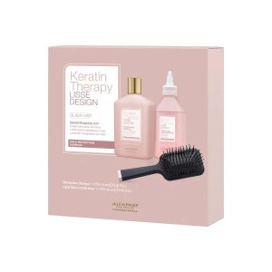 Odkryj profesjonalną pielęgnację włosów z zestawem Alfaparf Milano Keratin Therapy Lisse Design Glass Hair Kit ? to kompleksowe rozwiązanie stworzone z myślą o przedłużeniu efektu zabiegu keratynowego i uzyskaniu efektu ?glass hair? w domowym zaciszu. Zestaw łączy w sobie moc szamponu, innowacyjnej wody lamellarnej oraz ekskluzywnej szczotki, zapewniając włosom długotrwałą gładkość, olśniewający blask i wyjątkową miękkość nawet do 4 miesięcy. Idealny zarówno po zabiegu wygładzającym, jak i do codziennej pielęgnacji każdego rodzaju włosów.