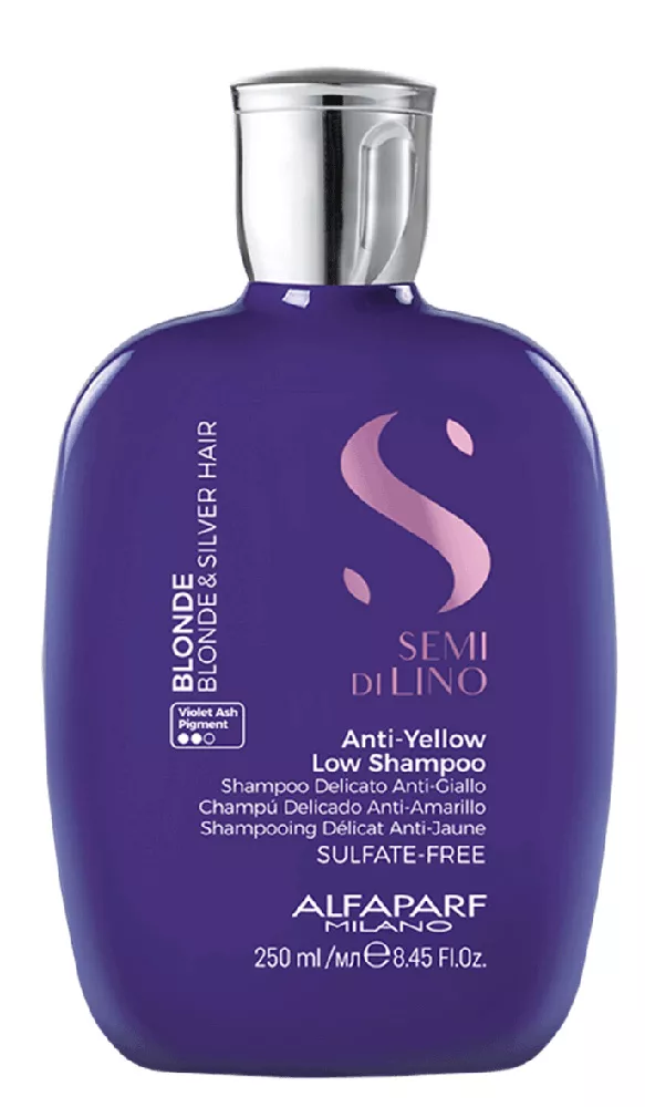 Z myślą o włosach blond i rozjaśnianych opracowano szampon do włosów Alfaparf Semi di Lino Blonde z fioletowym barwnikiem. Szampon skutecznie ochładza odcień włosów i neutralizuje żółte refleksy. To doskonałe rozwiązanie dla włosów blond, siwych i rozjaśnianych. Specjalna formuła nawilża kosmyki i pozostawia je wyjątkowo miękkie w dotyku oraz zrewitalizowane. Ponadto szampon tworzy na włosach specjalną tarczę, która odbija zanieczyszczenia środowiskowe i metale ciężkie. Alfaparf Blonde ponadto nabłyszcza włosy.