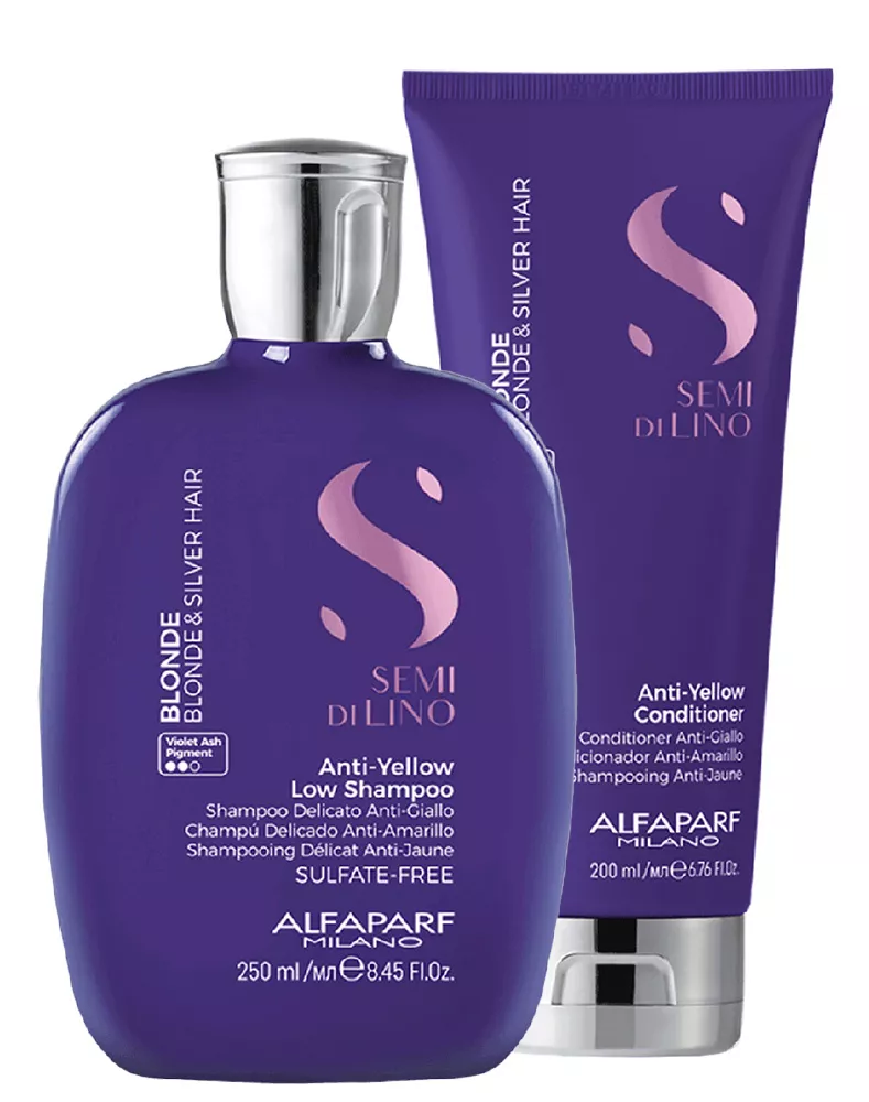 Kosmetyki do włosów Alfaparf Semi Di Lino Blonde ochładzają odcień włosów i szybko oraz skutecznie neutralizują żółte refleksy. Przeznaczone są do włosów blond, naturalnych, rozjaśnianych, siwych. Dzięki zawartości fioletowego barwnika kosmetyki dbają o piękny kolor. Dodatkowo nawilżają włosy i sprawiają, że kosmyki są miękkie w dotyku i błyszczące. Dzięki specjalnym kompleksom linia Alfaparf Blonde chroni włosy przed zanieczyszczeniami i pomaga zachować świetlisty kolor na dłużej. Wegańska formuła.