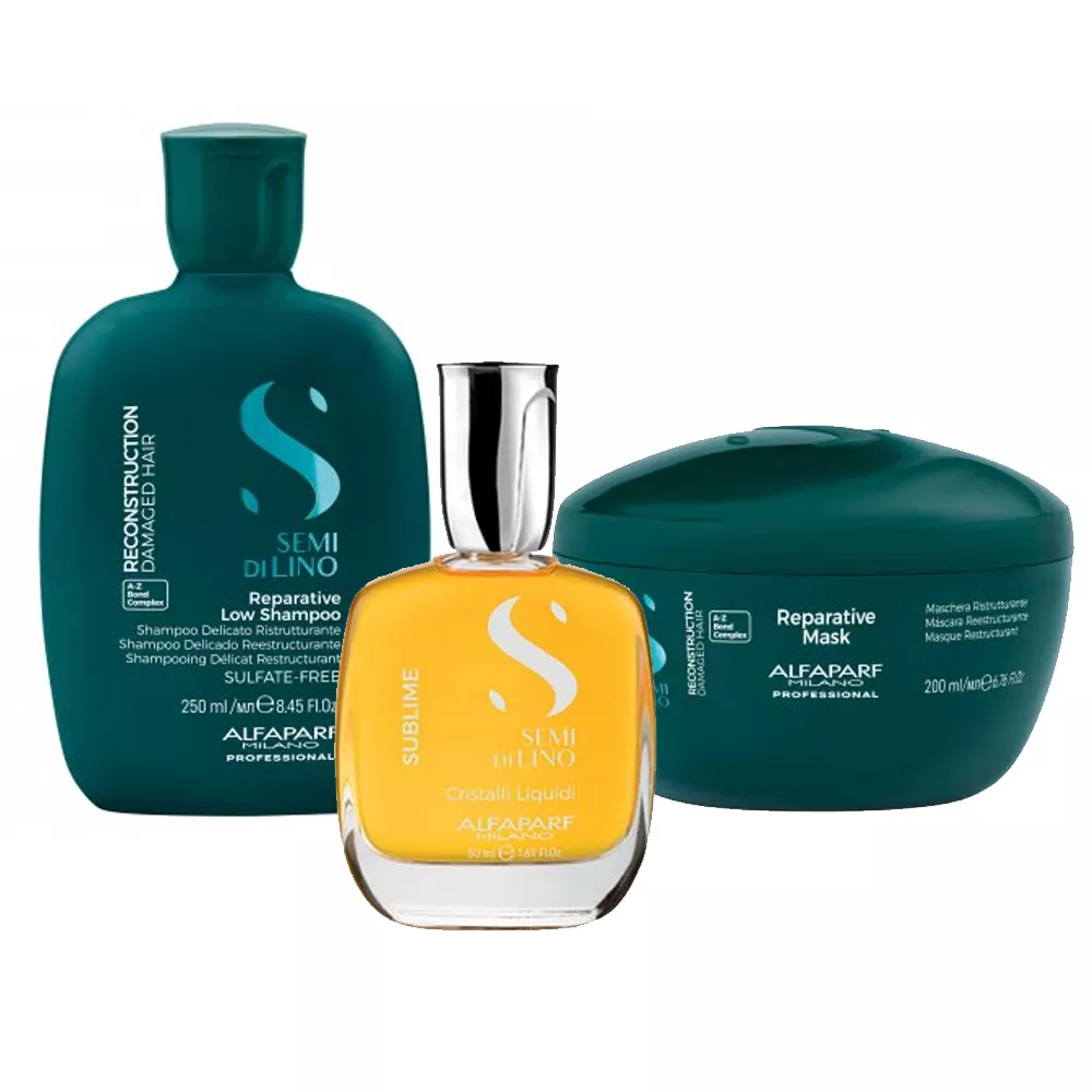 Alfaparf Milano Semi di Lino Reconstruction, zestaw odbudowujący do włosów zniszczonych, szampon + maska + olejek