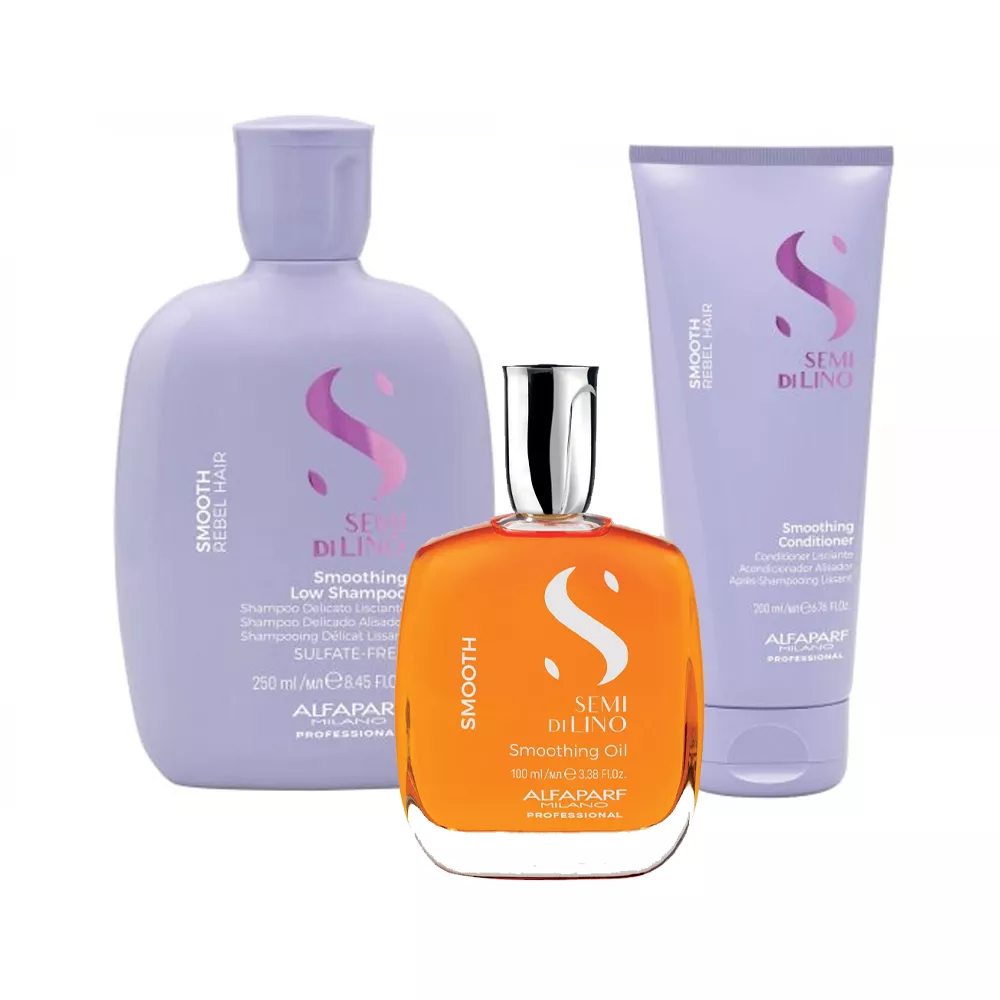 Zapomnij o niezdyscyplinowanych włosach, pozbawionych blasku i witalności. Sięgnij po szampon wygładzający Alfaparf Semi di Lino Smooth, który pomoże kontrolować włosy, zadziała nawilżająco i wygładzająco. Kosmetyk nie zawiera siarczanów i jest bardzo delikatny dla włosów. Zapewnia skuteczne oczyszczanie bez podrażniania. Sięgnij po odżywkę wygładzającą Alfaparf Semi di Lino Smooth, która pomoże kontrolować włosy, zadziała nawilżająco i wygładzająco. Kosmetyk pomaga rozplątać niesforne włosy i ułatwia ich układanie. Działa też dyscyplinująco, ułatwiając codzienną stylizację. Ten lekki olejek widocznie wygładza włosy, nadaje im blasku i działa dyscyplinująco, stając się must have w codziennej pielęgnacji. Kosmetyk stosuj na ostatnim etapie rutyny pielęgnacyjnej dla dodatkowego nabłyszczenia.