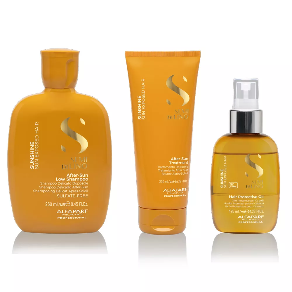 Alfaparf Milano Semi di Lino Sunshine, zestaw do włosów po ekspozycji na słońce, ochrona UV, szampon + kuracja + olejek