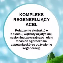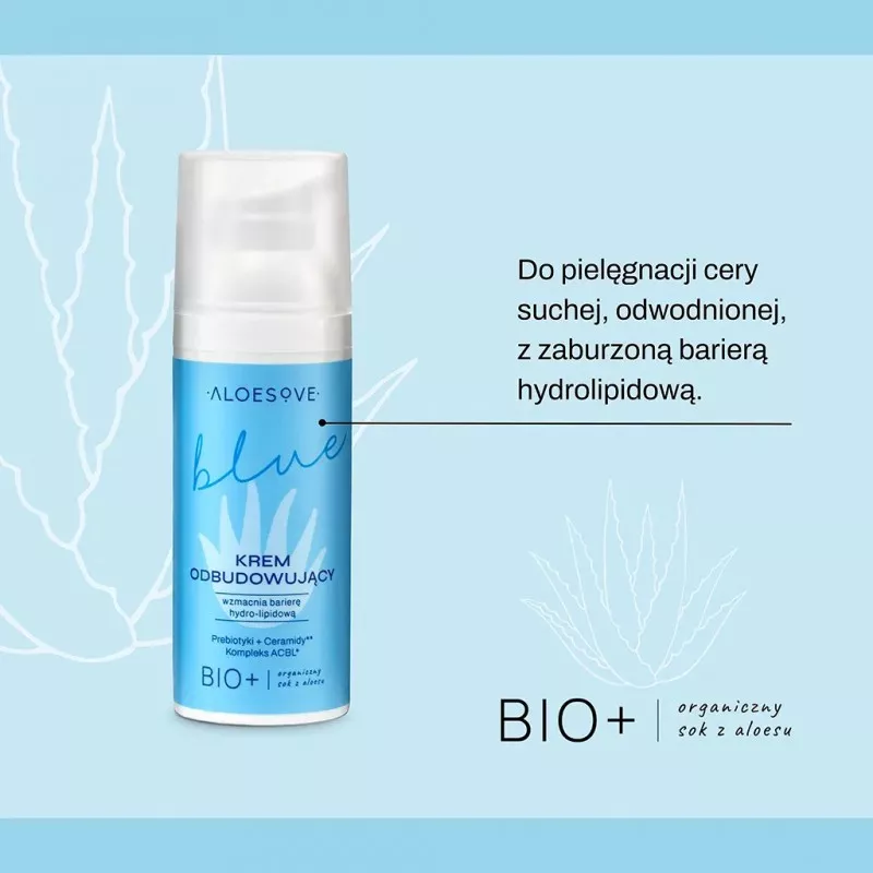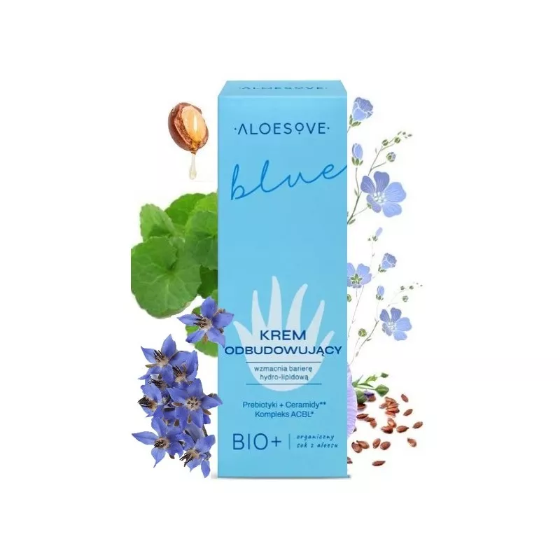 Krem Odbudowujący ALOESOVE BLUE to doskonała pielęgnacja dla suchej i odwodnionej cery z zaburzoną barierą hydrolipidową. Dzięki kompleksowi regenerującemu ACBL z ekstraktów aloesu, wąkroty azjatyckiej, lnu zwyczajnego i oleju z ogórecznika, krem intensywnie odżywia i regeneruje skórę. Naturalny prebiotyk - inulina oraz bioferment z wąkroty azjatyckiej stymulują rozwój pożytecznej mikroflory oraz przywracają skórze jej naturalną równowagę. Ceramidy w połączeniu z olejem ze słodkich migdałów, masłem Shea, mocznikiem i pentawityną intensywnie nawilżają, chroniąc przed szkodliwymi czynnikami zewnętrznymi. Produkt ma bardzo delikatny zapach i przyjemną, aksamitną formułę.