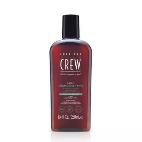 American Crew Classic 3w1 szampon odżywka i żel pod prysznic rumianek + sosna 250 ml. Uniwersalny szampon, odżywka i płyn do mycia ciała o kojącym aromacie rumianku i sosny. Formuła doskonale oczyszcza i nawilża zarówno włosy, jak i ciało, zapewniając jednocześnie obfite, luksusowe pienienie, które skutecznie usuwa zanieczyszczenia, pot oraz resztki produktów do stylizacji.