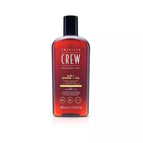 Wielofunkcyjny kosmetyk przeznaczony dla zabieganych mężczyzn, ceniących sobie czas. Łączy w sobie trzy istotne funkcje pielęgnacyjne. Jako szampon, odżywka do włosów i żel do kąpieli, jednocześnie oczyszcza włosy, skórę głowy, odżywia włosy i oczyszcza ciało. Minimalizm to domena niejednego mężczyzny, zatem produkt idealnie sprawdzi się w codziennej pielęgnacji. Wyjątkowa formuła produktu zapewnia kompleksową pielęgnację. Jako szampon oczyszcza skórę głowy i włosy z nadmiaru sebum. Jako odżywka wygładza włosy bez efektu ich obciążania. Jako żel do kąpieli czy pod prysznic oczyszcza i pielęgnuje ciało, otulając je energetyzującym zapachem imbiru i herbaty. Klasyczna, ciemno brązowa butelka, co jest znakiem rozpoznawczym American Crew sprawia, że produkt jest atrakcyjny i elegancki. Atutem produkty jest również fakt, że opakowanie wykonane jest w 80% z plastiku pochodzącego z recyklingu.