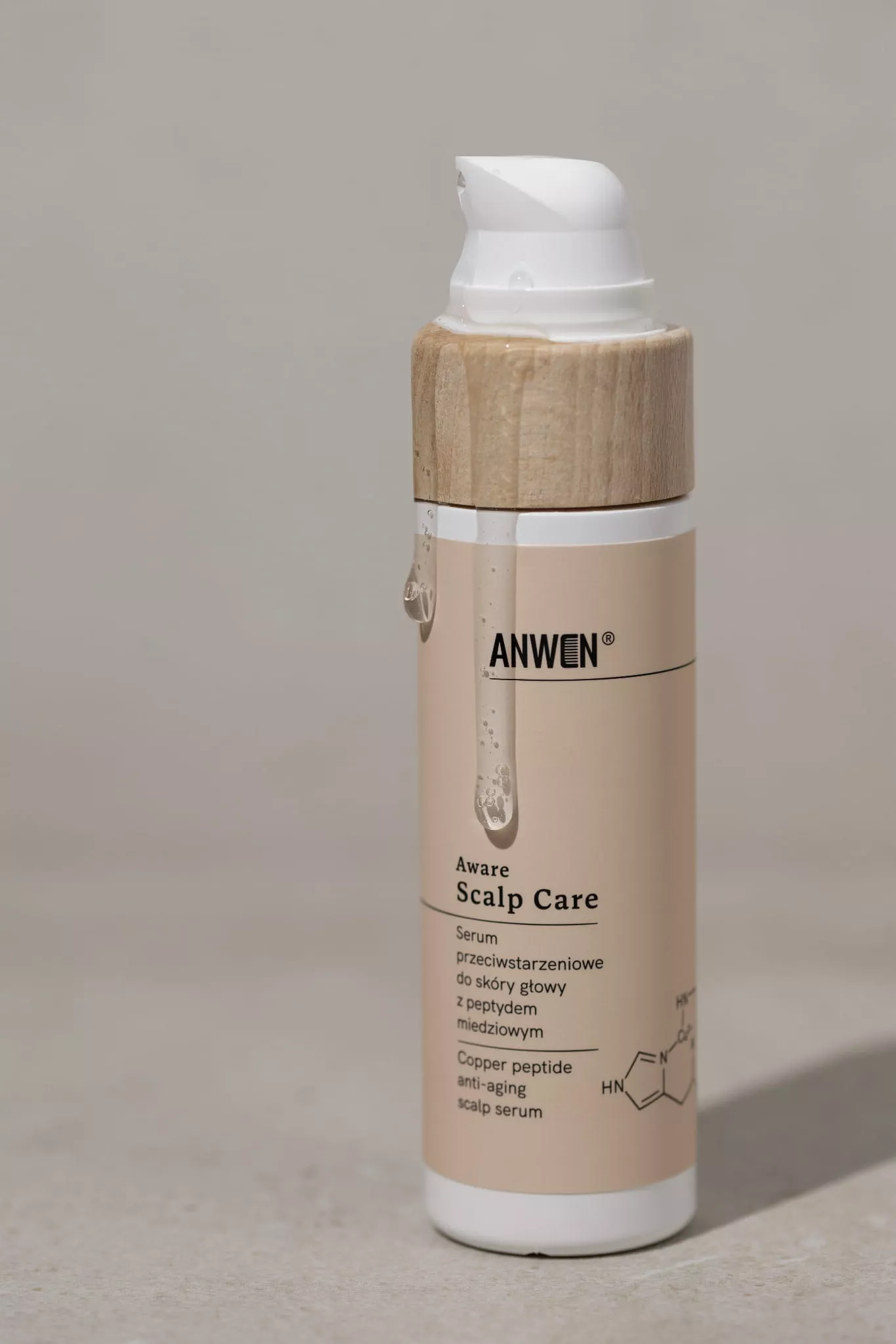 Nasze serum Anwen Aware Scalp Care to innowacyjne rozwiązanie dla skóry głowy, które łączy w sobie działanie przeciwstarzeniowe i nawilżające. Dzięki aktywnym składnikom, serum opóźnia oznaki starzenia, spowalnia siwienie włosów, dba o mikrobiom skóry głowy oraz zapewnia intensywne nawilżenie. Kluczowym składnikiem jest tripeptyd miedzi, który stymuluje naprawę i przebudowę skóry, działa ujędrniająco i wspomaga wzrost włosów poprzez powiększanie mieszków włosowych. Biologicznie aktywne fermenty ekstraktów roślinnych pobudzają produkcję kolagenu, wspierając równowagę mikrobiomu. Niskocząsteczkowy kwas hialuronowy zwiększa elastyczność skóry, opóźniając jej starzenie. Roślinny kolagen oferuje doskonałe właściwości antyoksydacyjne, poprawiając kondycję i jędrność skóry. Esencja ze skórek mandarynek, produkowana w procesie upcyclingu, zwiększa ilość melaniny w mieszkach włosowych, co jest kluczowe w procesie spowalniania siwienia.