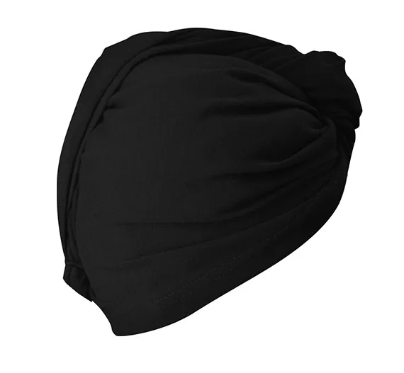 Pochyl głowę do przodu, nałóż turban, umieść w nim włosy, zawiń w rulon i zepnij z tyłu za pomocą gumowej pętelki.