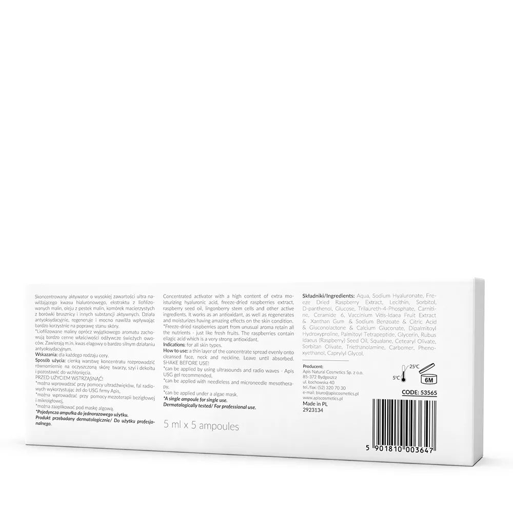 Apis Aktywator z liofilizowanymi malinami to zaawansowany koncentrat o wysokiej zawartości ultra nawilżającego kwasu hialuronowego, wzbogacony ekstraktem z liofilizowanych malin, olejem z pestek malin oraz komórkami macierzystymi z borówki brusznicy. Produkt ten działa antyoksydacyjnie, regeneruje i intensywnie nawilża skórę, poprawiając jej stan i wygląd. Liofilizowane maliny, oprócz wyjątkowego aromatu, zachowują cenne właściwości odżywcze świeżych owoców, w tym silne działanie antyoksydacyjne kwasu elagowego.