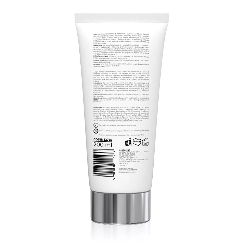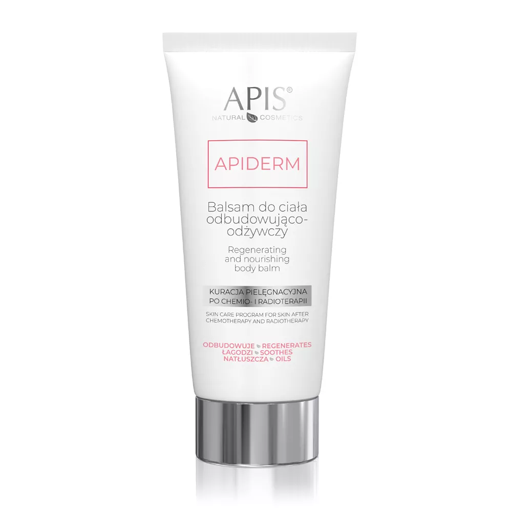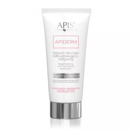 Apis Apiderm to balsam do ciała dedykowany osobom z bardzo suchą i szczególnie wrażliwą skórą, zwłaszcza po zabiegach chemio- i radioterapii. Jego lekka formuła zapewnia szybkie wchłanianie oraz wielozadaniowe działanie. Dzięki zawartości oleju słonecznikowego, lnianego, arganowego, kokosowego, masła shea i skwalenu z oliwek, balsam dostarcza niezbędnych składników odżywczych i natłuszczających, wspierając odbudowę płaszcza hydrolipidowego skóry. Produkt działa kojąco, wygładza, łagodzi podrażnienia oraz zmniejsza uczucie swędzenia.