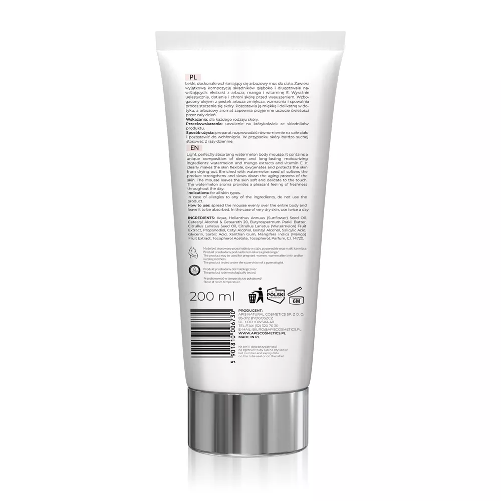 Apis Arbuzowe Orzeźwienie to lekki, doskonale wchłaniający się arbuzowy mus do ciała, który zapewnia głębokie i długotrwałe nawilżenie skóry. Dzięki unikalnej kompozycji ekstraktu z arbuza, mango i witaminy E, produkt wyraźnie uelastycznia, dotlenia oraz chroni skórę przed wysuszeniem. Wzbogacony olejem z pestek arbuza, mus zmiękcza, wzmacnia i spowalnia proces starzenia się skóry. Pozostawia skórę miękką i delikatną, a jego arbuzowy aromat zapewnia przyjemne uczucie świeżości przez cały dzień.