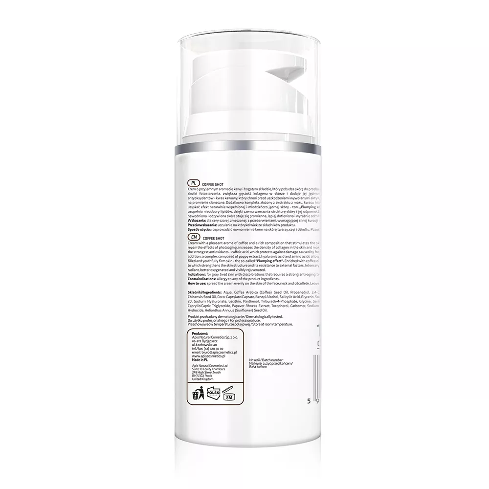 Krem o przyjemnym aromacie kawy i bogatym składzie, który pobudza skórę do przebudowy i rewitalizacji. Pozwala naprawić skutki fotostarzenia, zwiększa gęstość kolagenu w skórze i dodaje jej jędrności. Zawiera jeden z najsilniejszych antyoksydantów - kwas kawowy, który chroni przed uszkodzeniami wywołanymi aktywnością wolnych rodników i ekspozycją na promienie słoneczne. Dodatkowo kompleks złożony z ekstraktu z maku, kwasu hialuronowego i aminokwasów pozwala uzyskać efekt naturalnie wypełnionej i młodzieńczo jędrnej skóry - tzw. „Plumping effect”. Wzbogacony olejem kawowym uzupełnia niedobory lipidów, dzięki czemu wzmacnia strukturę skóry i jej odporność na czynniki zewnętrzne. Intensywnie nawodniona i odżywiona skóra staje się promienna, lepiej dotleniona i wyraźnie odmłodzona.
