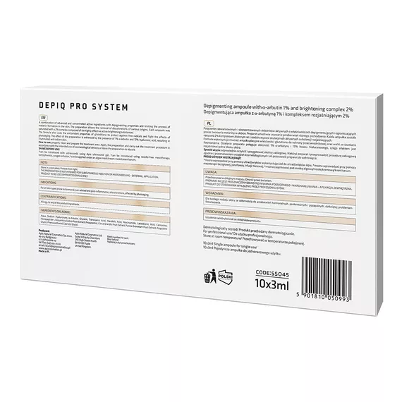 Apis Depiq Pro System, depigmentujące ampułki oferują zaawansowane i skoncentrowane składniki aktywne, które działają depigmentująco i ograniczają proces tworzenia melaniny w skórze. Produkt skutecznie usuwa przebarwienia różnego pochodzenia, dzięki czemu cera zyskuje świeży, jednolity wygląd. Każda ampułka zawiera 2% kompleks sześciu skutecznych substancji rozjaśniających oraz 1% α-arbutyny, co w połączeniu z 13% kwasem hialuronowym zapewnia skórze rozjaśnienie i blask. Dodatkowo, preparat chroni przed wolnymi rodnikami i skutkami fotostarzenia dzięki obecności glutationu.