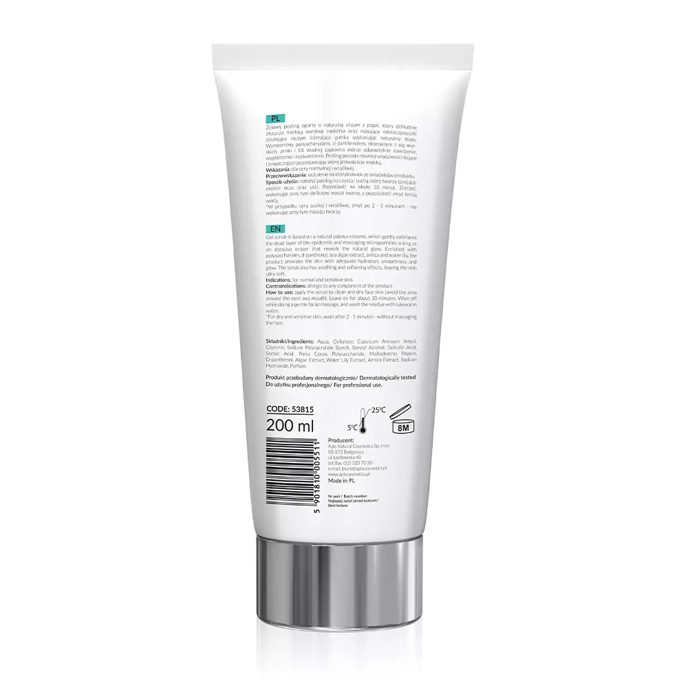 Odkryj moc natury z Apis Enzymatycznym peelingiem gommage o pojemności 200 ml. Ten żelowy peeling wykorzystuje naturalny enzym z papai, aby delikatnie złuszczać martwy naskórek, odsłaniając naturalny blask skóry. Wzbogacony o masujące mikrocząsteczki działa jak ścierająca gumka, zapewniając jedwabiście gładką skórę.