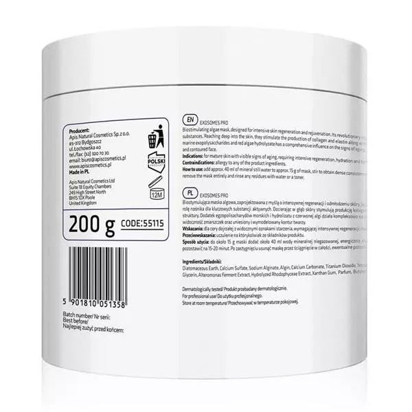 Biostymulująca maska algowa Apis Exosomes Pro to innowacyjne rozwiązanie dla intensywnej regeneracji i odmłodzenia skóry. Dzięki rewolucyjnym roślinnym egzosomom, które działają jako nośniki substancji aktywnych, maska stymuluje produkcję kolagenu i elastyny oraz wspiera odnowę komórkową. To prowadzi do zagęszczenia i wzmocnienia struktury skóry. Dodatkowo, egzopolisacharydy morskie i hydrolizat z czerwonej algi wspomagają redukcję oznak starzenia, poprawiają strukturę skóry oraz modelują kontury twarzy.