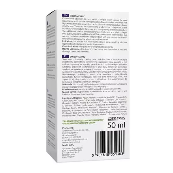Apis Exosomes Pro Home Terapis to innowacyjny biostymulujący krem z roślinnymi egzosomami, stworzony w celu przywrócenia skórze odświeżonego i promiennego wyglądu. Redukuje widoczne oznaki starzenia dzięki zawartości mikroskopijnych nanopęcherzyków pochodzących z komórek macierzystych. Te niewielkie cząsteczki łatwo przenikają przez struktury skóry, stymulując produkcję kolagenu i regenerację komórkową. Dodatek egzopolisacharydów morskich i kwasu hialuronowego zapewnia głębokie nawilżenie, sprawiając, że skóra staje się bardziej jędrna i elastyczna. Produkt posiada pH neutralne dla skóry.