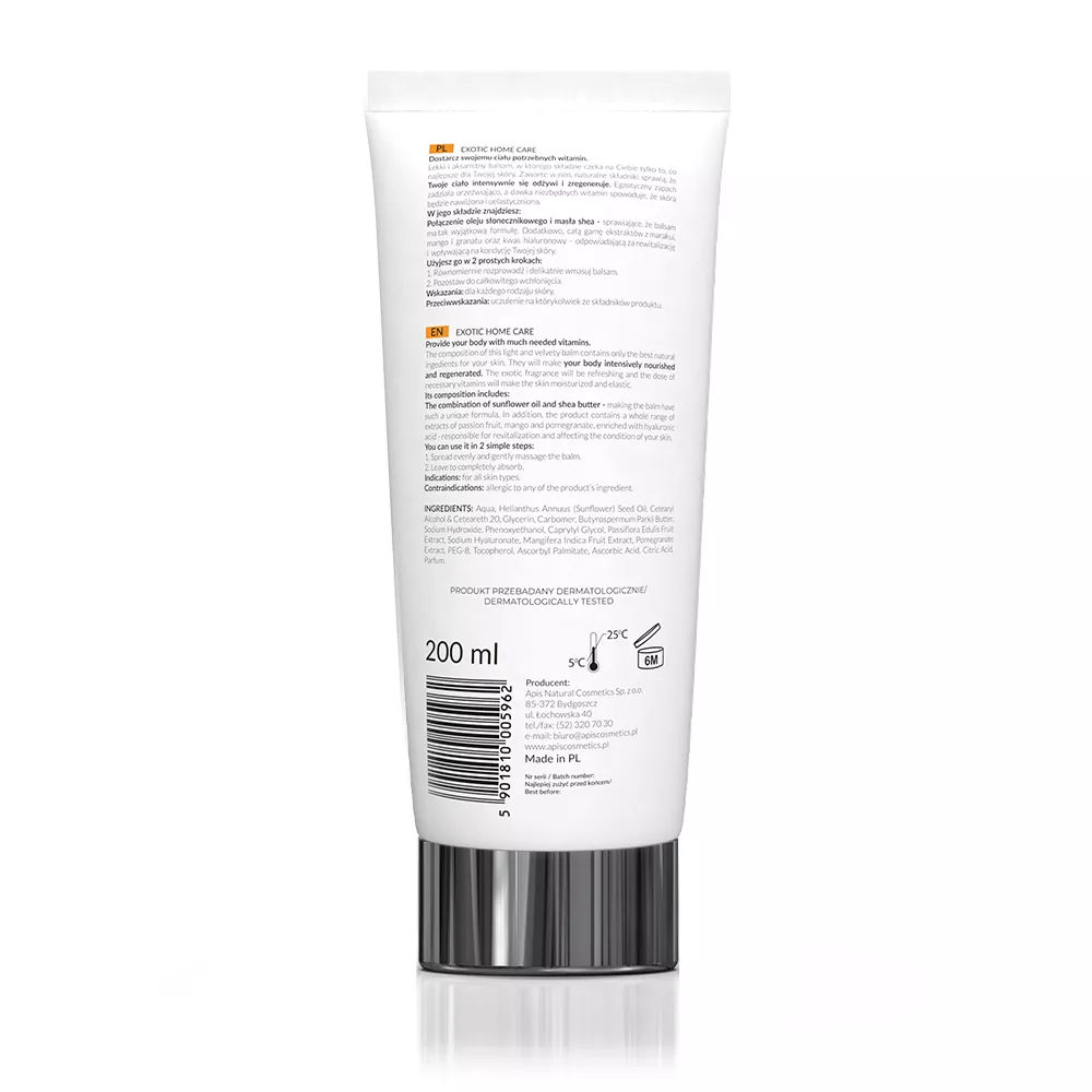 Apis Exotic Home Care to egzotyczny balsam witalizujący do ciała, który dostarcza skórze niezbędnych witamin. Ten lekki i aksamitny balsam zawiera starannie dobrane, naturalne składniki, które intensywnie odżywiają i regenerują Twoją skórę. Egzotyczny zapach działa orzeźwiająco, a dawka niezbędnych witamin zapewnia skórze nawilżenie i elastyczność.