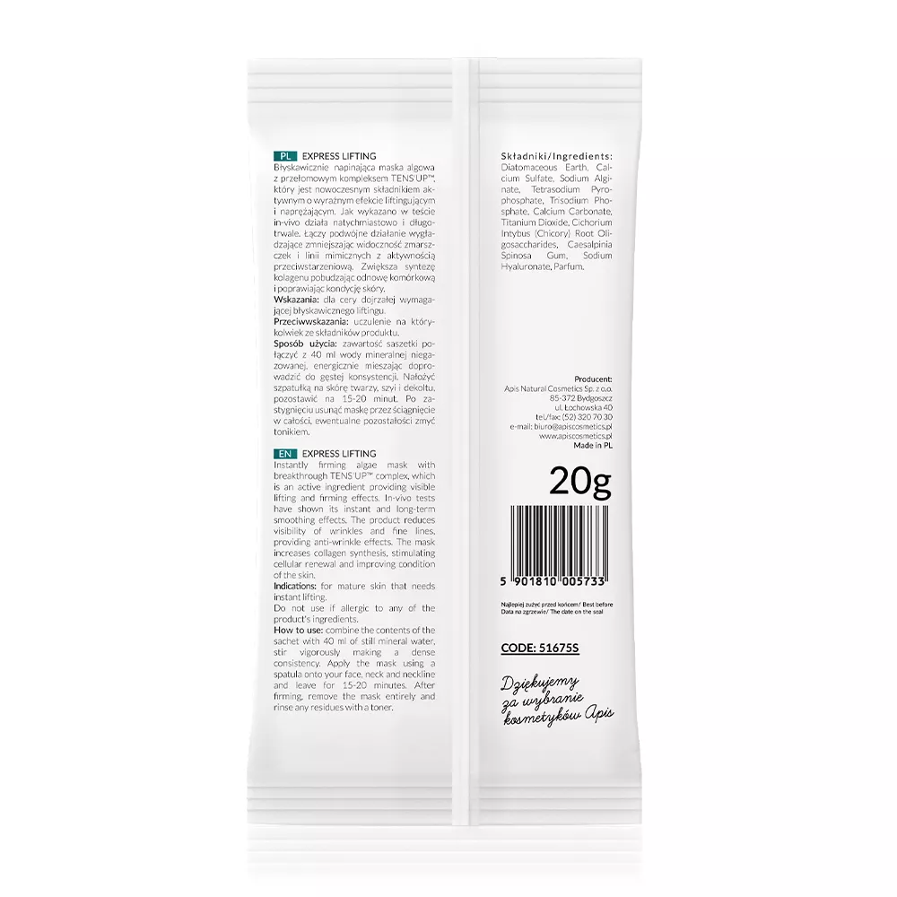 Apis Express Lifting to maska algowa, która zapewnia intensywne napięcie skóry dzięki innowacyjnemu kompleksowi TENS'UP™. Ten przełomowy składnik aktywny oferuje natychmiastowy i długotrwały efekt liftingujący, skutecznie wygładzając zmarszczki oraz linie mimiczne, jednocześnie wspierając aktywność przeciwstarzeniową. Dzięki stymulacji syntezy kolagenu i odnowie komórkowej, maska poprawia kondycję skóry, co czyni ją idealnym wyborem dla cery dojrzałej, wymagającej szybkiego liftingu.