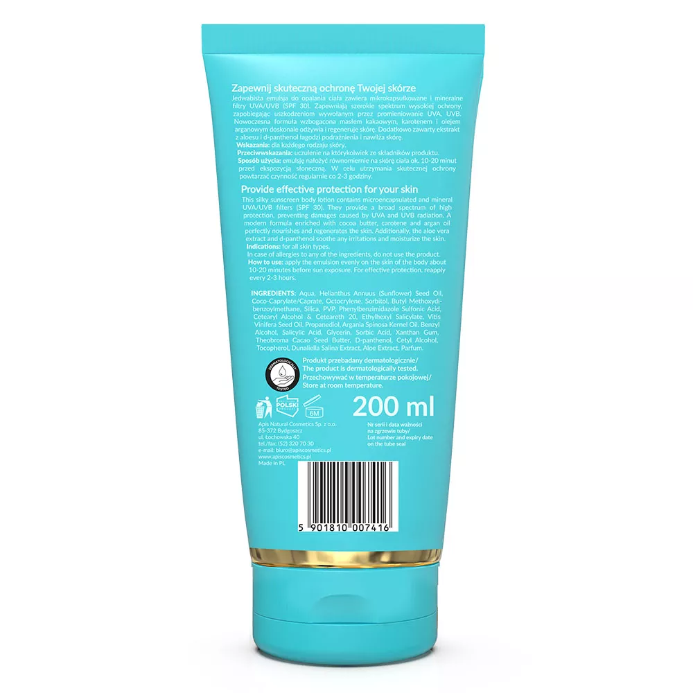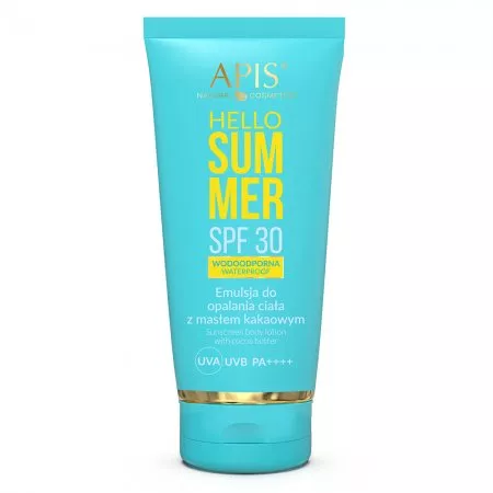 Odkryj skuteczną ochronę przeciwsłoneczną z Apis Hello Summer, emulsją do opalania ciała z masłem kakaowym SPF 30. Ta jedwabista emulsja została stworzona, aby zapewnić Twojej skórze szerokie spektrum ochrony przed szkodliwym promieniowaniem UVA i UVB, jednocześnie dbając o jej odżywienie i regenerację.