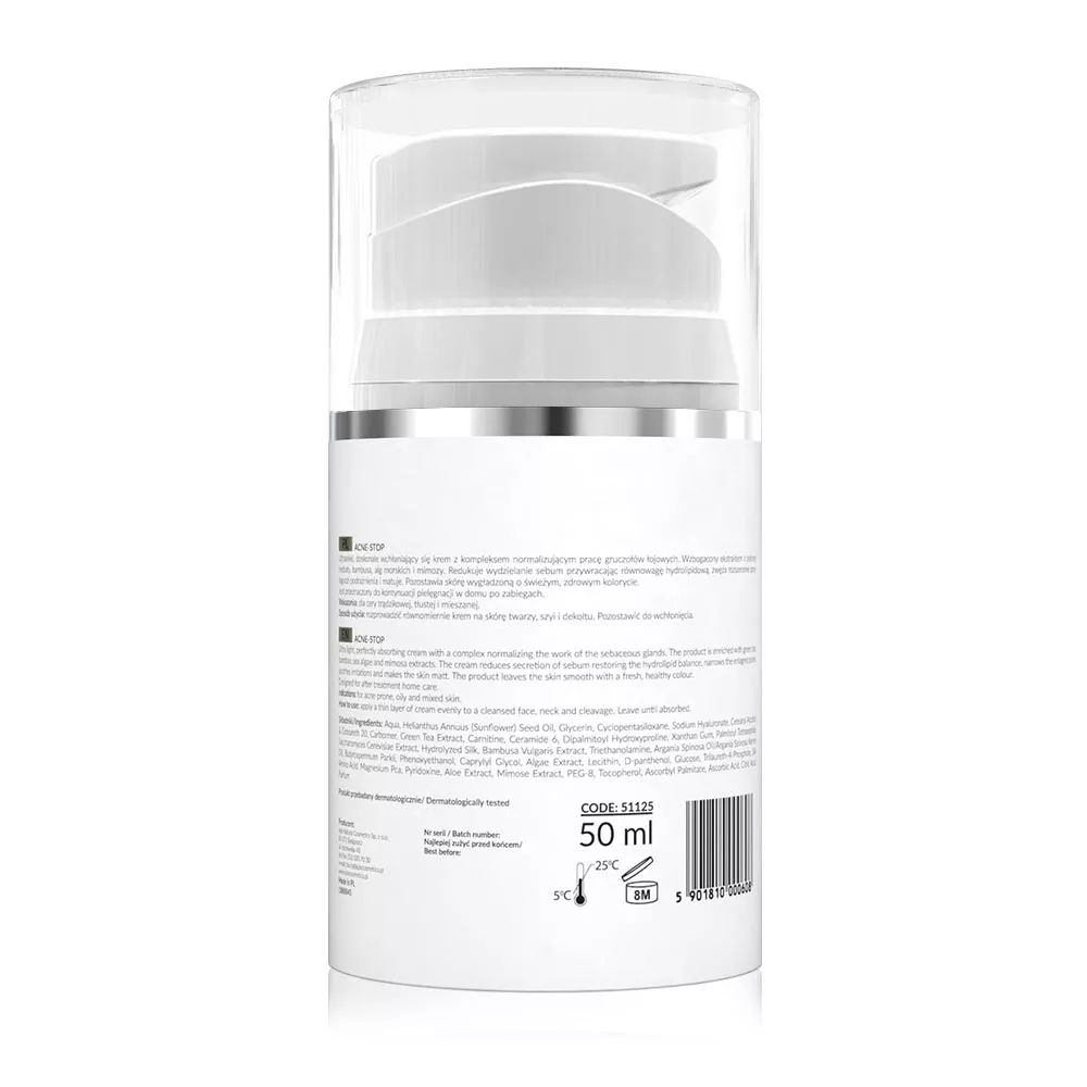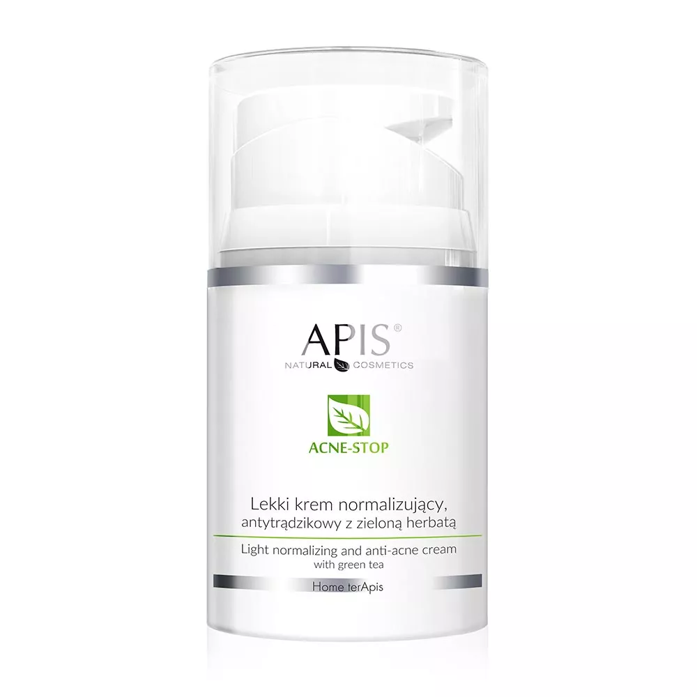Apis Home terApis Acne-stop to krem przeznaczony dla osób o cerze trądzikowej, tłustej i mieszanej. Formuła tego kremu zawiera ekstrakty z zielonej herbaty, bambusa, alg morskich oraz mimozy, które razem skutecznie redukują wydzielanie sebum, przywracając równowagę hydrolipidową skóry. Produkt zwęża rozszerzone pory, łagodzi podrażnienia oraz matuje skórę, pozostawiając ją wygładzoną i o świeżym, zdrowym kolorycie.