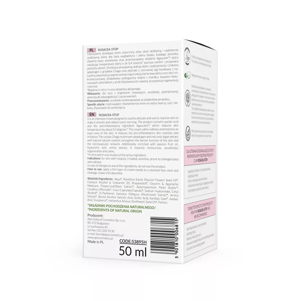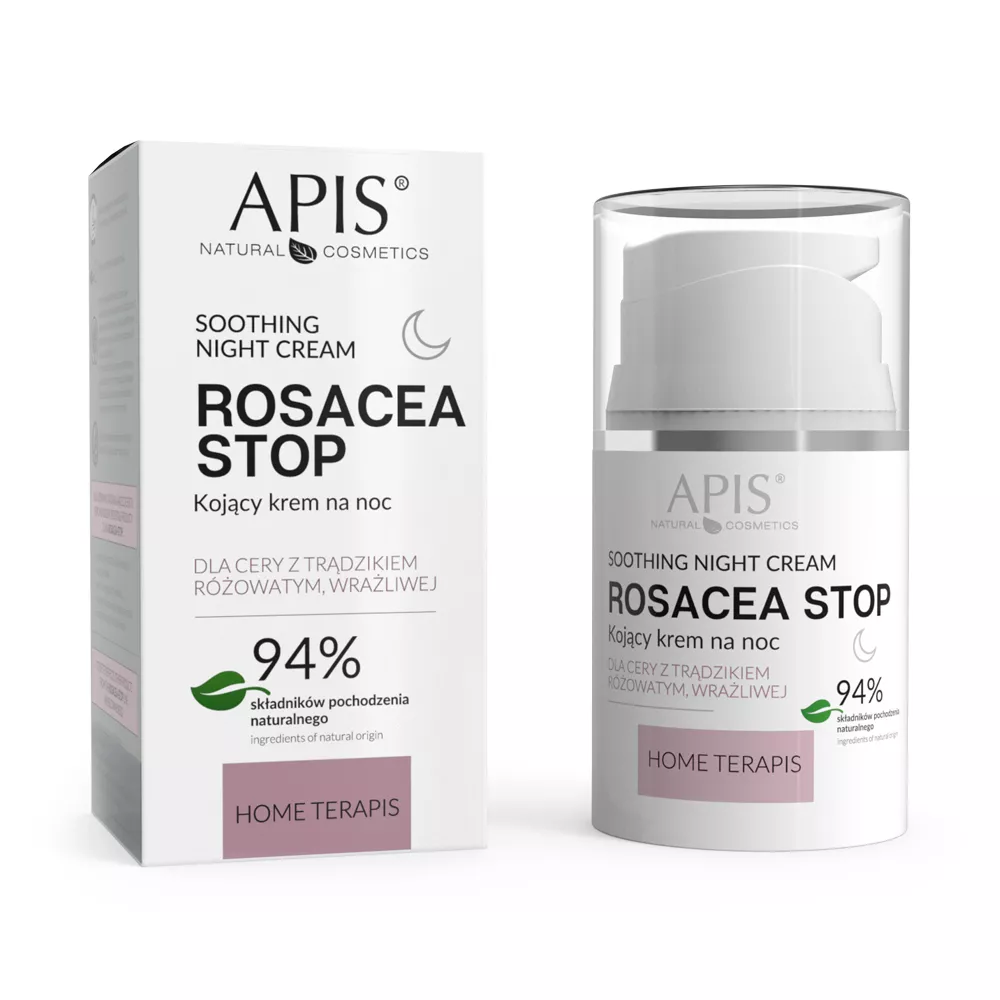 Apis Home terApis Rosacea Stop to kojący krem na noc zaprojektowany specjalnie dla delikatnej i nadmiernie reaktywnej skóry. Dzięki swojej intensywnej formule, pozostawia skórę wygładzoną i pełną blasku każdego poranka. Produkt zawiera kwas azelainowy oraz innowacyjny składnik Agascalm™, który obniżając temperaturę skóry o około 0,4 stopnia, skutecznie wycisza rumień i przywraca jednolity odcień cery.