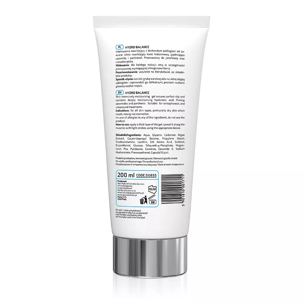 Apis Hydro Balance to żel do ultradźwięków stworzony specjalnie dla cery suchej. Ten intensywnie nawilżający produkt zapewnia doskonały poślizg podczas zabiegów, jednocześnie dostarczając skórze niezbędnych składników odżywczych. W skład żelu wchodzą kwas hialuronowy, ekstrakt z alg morskich, ceramidy oraz d-panthenol, które razem tworzą unikalną formułę wspierającą zdrowy wygląd skóry.