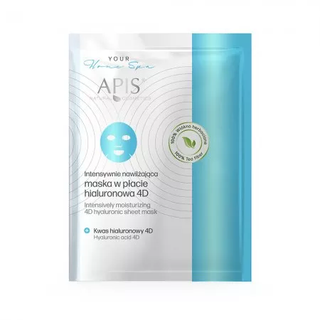 Apis intensywnie nawilżająca maska w płacie hialuronowa 4D, 20g, to wyjątkowy produkt stworzony z myślą o dogłębnym nawilżeniu skóry twarzy. Wykonana z naturalnego płatu z zielonej herbaty, maska jest nasączona innowacyjnym kwasem hialuronowym 4D, który łączy 4 różne wielkości cząsteczek hialuronianów. Dzięki temu działa na różnych poziomach skóry, zapewniając intensywne nawilżenie oraz efekt wygładzenia i lekkiego napięcia, który przypomina „drugą skórę”.