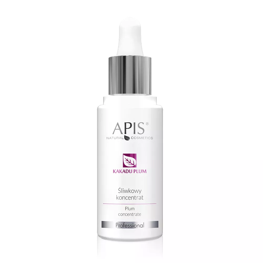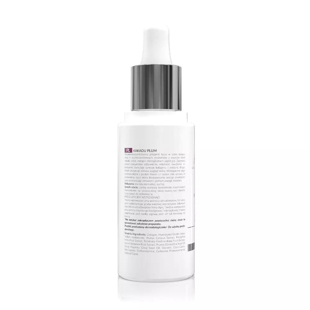 Apis Kakadu plum, Koncentrat śliwkowy to wysoko skoncentrowany preparat przeznaczony dla cery normalnej i suchej. Zawiera unikalną kompozycję 4 multiwitaminowych ekstraktów z owoców: australijskiej śliwki kakadu, znanej jako największe na świecie źródło witaminy C, wiśni, mango oraz ekologicznych jagód goji. Dzięki temu koncentrat zapewnia skórze maksymalne odżywienie, witalność i nawilżenie.