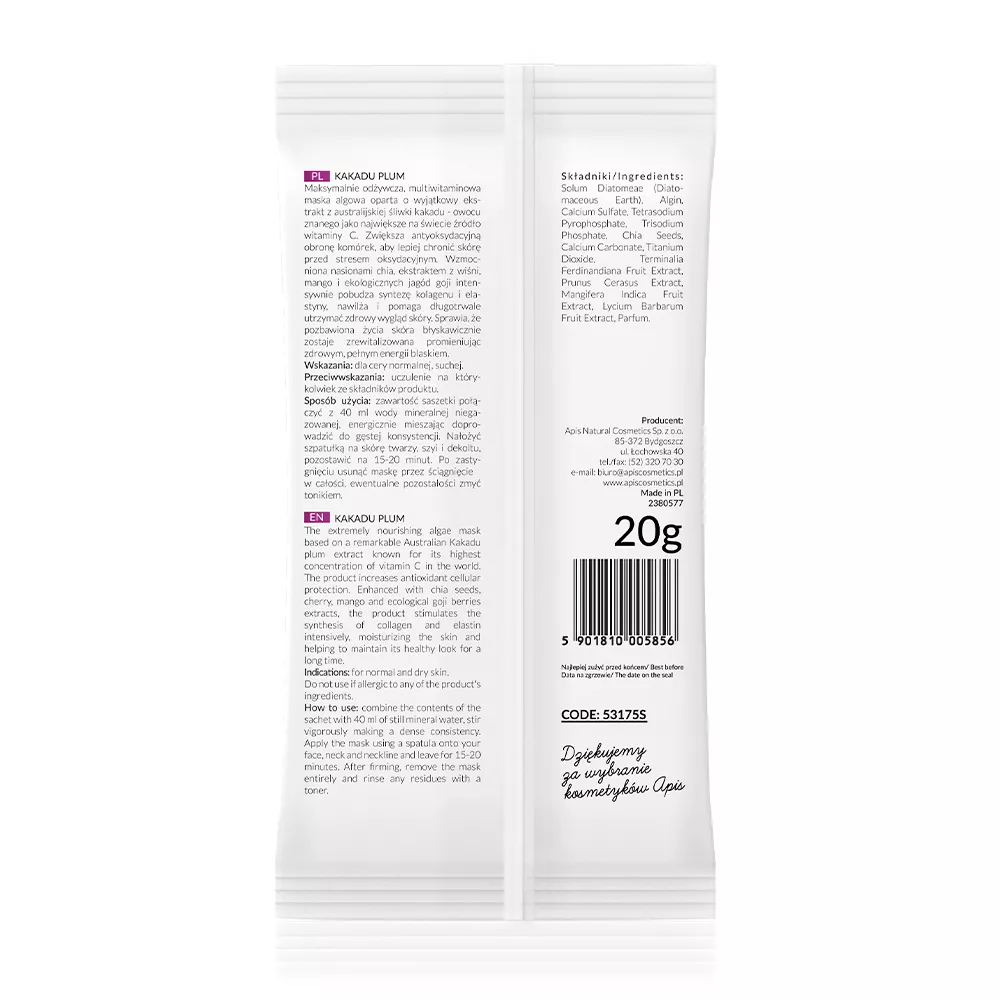 Apis Kakadu Plum to śliwkowa maska algowa z nasionami chia, która dostarcza skórze intensywnego odżywienia i multiwitaminowego wsparcia. Wzbogacona o wyjątkowy ekstrakt z australijskiej śliwki kakadu, będącej największym na świecie źródłem witaminy C, maska zwiększa antyoksydacyjną obronę komórek. Dzięki temu lepiej chroni skórę przed stresem oksydacyjnym.