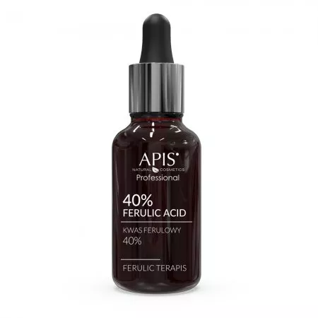 Apis Kwas Ferulowy 40% to preparat eksfoliujący o stężeniu 40% i pH 1,9, który wyróżnia się silnymi właściwościami antyoksydacyjnymi. Zapobiega procesom starzenia się skóry, poprawia jej kondycję i koloryt, chroni przed fotostarzeniem oraz pobudza mechanizmy obronne skóry. Kwas ferulowy skutecznie ogranicza powstawanie wolnych rodników i chroni komórki przed ich szkodliwym wpływem.