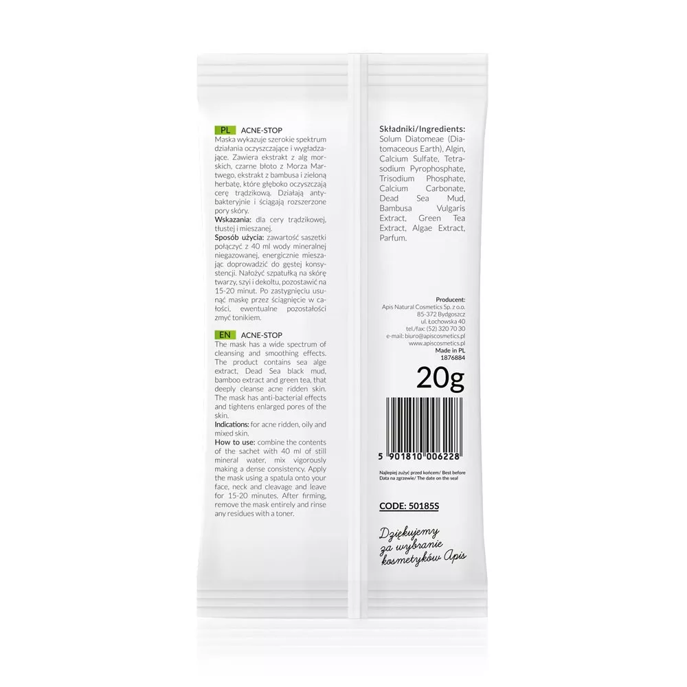 Apis Maska algowa dla cery trądzikowej z bambusem i zieloną herbatą to zaawansowane rozwiązanie oczyszczające i wygładzające skórę. Dzięki unikalnej formule zawierającej ekstrakt z alg morskich, czarne błoto z Morza Martwego, ekstrakt z bambusa oraz zieloną herbatę, maska skutecznie oczyszcza cerę trądzikową, działając antybakteryjnie i zwężając rozszerzone pory skóry.
