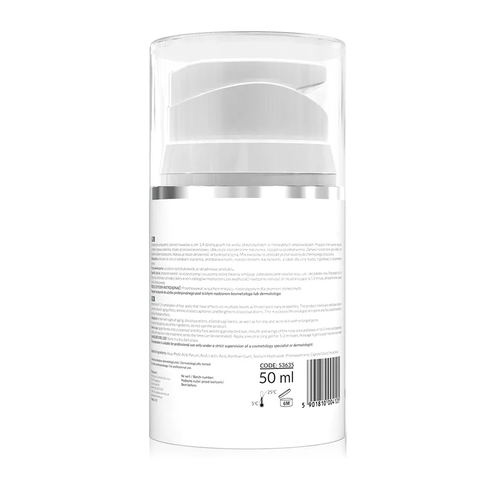 Preparat nanieść na oczyszczoną i osuszoną skórę twarzy, omijając zabezpieczone okolice oczu, ust i skrzydełek nosa. Pozostawić na 2-4 minuty (w zależności od reakcji skóry w serii zabiegów można ten czas wydłużać), następnie nałożyć żel neutralizujący na 1-2 minuty, delikatnie wmasować i zmyć chłodną wodą. Przed użyciem wstrząsnąć! Przechowywać w suchym miejscu, niedostępnym dla promieni słonecznych. Preparat wyłącznie do użytku profesjonalnego pod ścisłym nadzorem kosmetologa lub dermatologa.