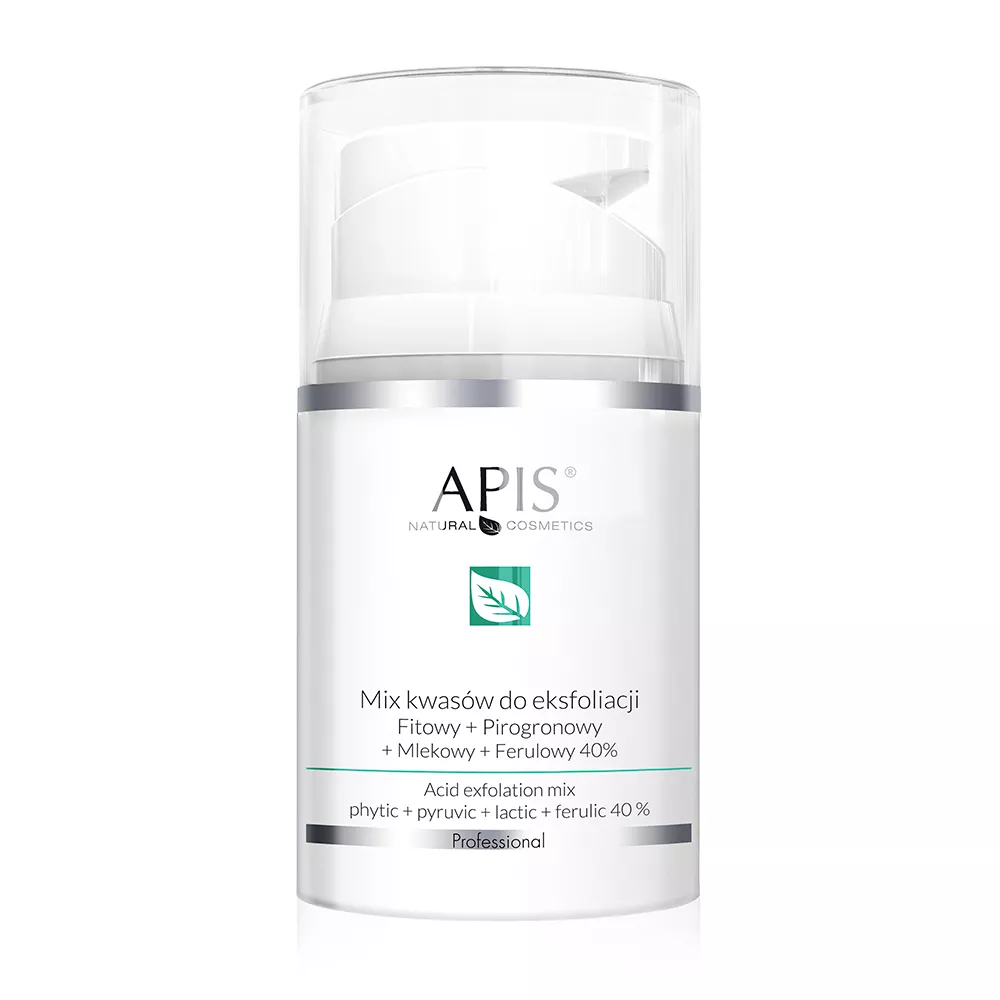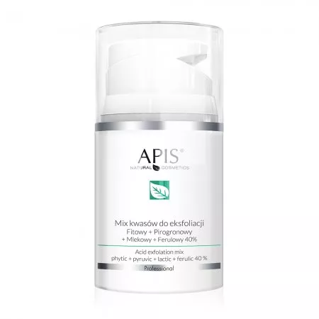 Apis Mix kwasów 40 % to innowacyjne połączenie czterech kwasów: fitowego, progronowego, mlekowego i ferulowego, o pH 1,4. Ten preparat działa na wielu płaszczyznach, oferując niezwykłe właściwości dla Twojej skóry. Produkt intensywnie złuszcza warstwę rogową naskórka, działa przeciwstarzeniowo, obkurcza rozszerzone naczynka, rozjaśnia przebarwienia, zamyka rozszerzone pory skóry i ma działanie bakteriostatyczne. Dodatkowo wykazuje aktywność antyoksydacyjną, dzięki czemu jest idealnym wyborem do chemicznego złuszczania.