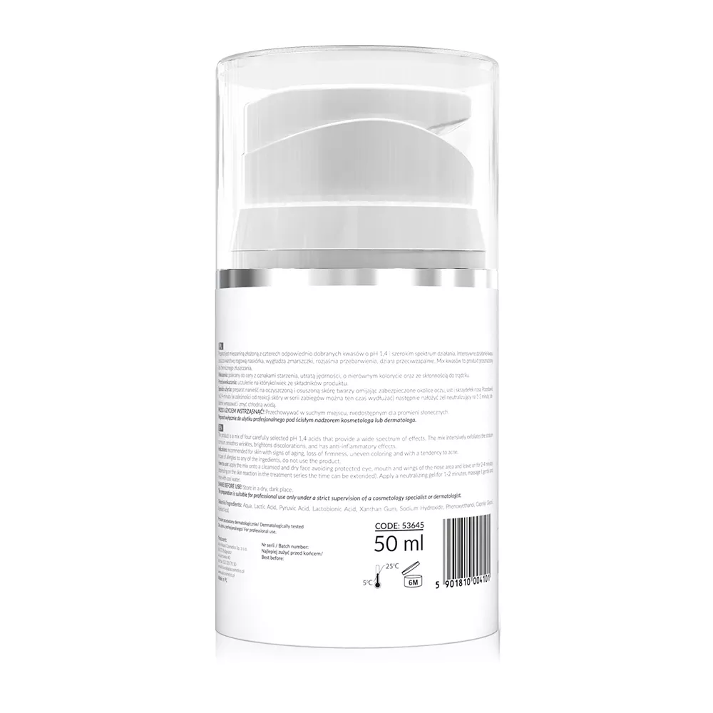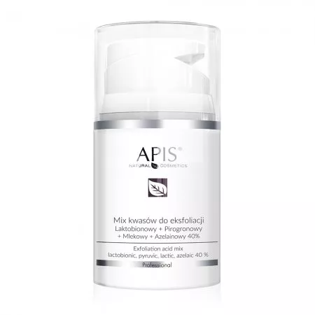 Apis, mix kwasów do eksfoliacji 40%, to zaawansowany preparat oparty na kombinacji czterech starannie dobranych kwasów: laktobionowego, pirogronowego, mlekowego i azelainowego. Dzięki pH 1,4 oraz intensywnemu działaniu, produkt skutecznie złuszcza warstwę rogową naskórka, wygładza zmarszczki, rozjaśnia przebarwienia i działa przeciwzapalnie. Jest idealnym rozwiązaniem do chemicznego złuszczania skóry.