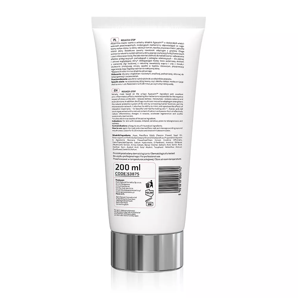 Aksamitna maska Apis Rosacea-Stop, wzbogacona o unikalny składnik Agascalm™, oferuje doskonałe właściwości przeciwzapalne, modulując mechanizmy stresu na skórze. Skutecznie redukuje rumień, nawilża oraz przywraca blask i jednolity odcień skóry. Dzięki nowatorskiemu adaptogenowi z grzybów Chaga wzmacnia naturalny system ochronny skóry, stymulując funkcje barierowe i sieć mikronaczyniową. Maska nie tylko naśladuje efekty pielęgnacyjne zabiegów relaksacyjnych, ale także zapewnia piękny i zdrowy wygląd skóry.