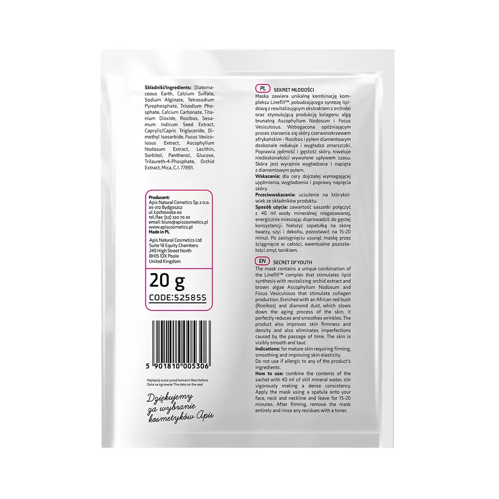 Apis Sekret Młodości, Maska algowa, 20g to doskonała propozycja dla cery dojrzałej, która wymaga ujędrnienia, wygładzenia oraz poprawy napięcia skóry. Produkt ten zawiera unikalną kombinację składników aktywnych, które wspierają rewitalizację skóry oraz opóźniają proces jej starzenia.