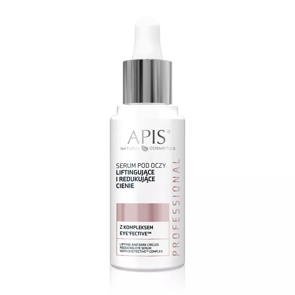 Apis Serum pod oczy liftingujące i redukujące cienie z kompleksem Eye'fective™ to idealne rozwiązanie dla dojrzałej skóry wokół oczu, która wymaga redukcji cieni, ujędrnienia i wygładzenia. To wielozadaniowe serum zawiera aktywny kompleks Eye'fective™, który skutecznie redukuje cienie pod oczami poprzez poprawę przepuszczalności naczyń krwionośnych oraz mikrokrążenia. Dodatkowo, serum działa liftingująco, zmniejszając opadanie górnej powieki, co sprawia, że skóra wokół oczu jest zregenerowana, nawilżona, wygładzona i pełna blasku.