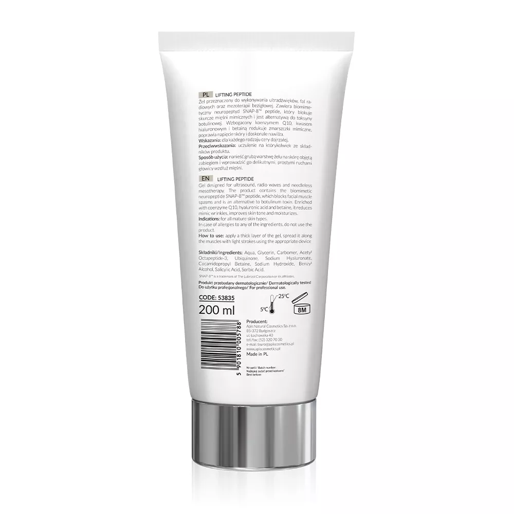 Odkryj Apis Żel do ultradźwięków liftingująco-napinający z SNAP-8 peptide, stworzony specjalnie dla każdego rodzaju cery dojrzałej. Ten innowacyjny żel to doskonałe rozwiązanie do zabiegów ultradźwiękowych, fal radiowych oraz mezoterapii bezigłowej. Zawiera biomimetyczny neuropeptyd SNAP-8™ peptide, który skutecznie blokuje skurcze mięśni mimicznych, oferując bezpieczną alternatywę dla toksyny botulinowej. Dzięki wzbogaceniu koenzymem Q10, kwasem hialuronowym i betainą, żel redukuje zmarszczki mimiczne, poprawia napięcie skóry i zapewnia intensywne nawilżenie.