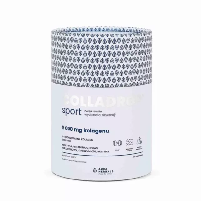 Colladrop® Sport to suplement diety w saszetkach, stworzony z myślą o osobach aktywnych fizycznie. Każda saszetka zawiera 5000 mg hydrolizowanego kolagenu morskiego, który wspiera zdrowie stawów i tkanki łącznej. Produkt wzbogacony jest o witaminę C, kreatynę, kwas hialuronowy, koenzym Q10 oraz biotynę, co czyni go idealnym wyborem dla sportowców i osób dbających o kondycję fizyczną. Smak mango-marakuja dodatkowo umila codzienne spożycie.