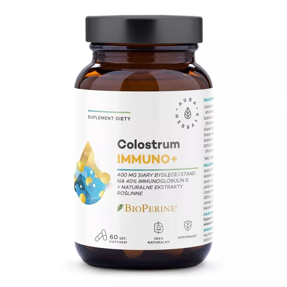 Aura Herbals Colostrum Immuno + BioPerine to suplement diety dostępny w postaci 60 kapsułek, zaprojektowany z myślą o wsparciu układu odpornościowego. Produkt charakteryzuje się unikalnym połączeniem colostrum oraz BioPerine®, co czyni go wyjątkowym wyborem dla osób dbających o zdrowie.
