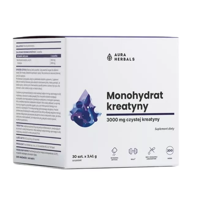 Aura Herbals Kreatyna Monohydrat to suplement diety w wygodnych saszetkach, idealny dla osób aktywnych fizycznie, które chcą zwiększyć swoją wydolność. W każdej porcji znajdziesz 3 g kreatyny, która wspiera organizm podczas intensywnych, krótkotrwałych i powtarzalnych ćwiczeń.