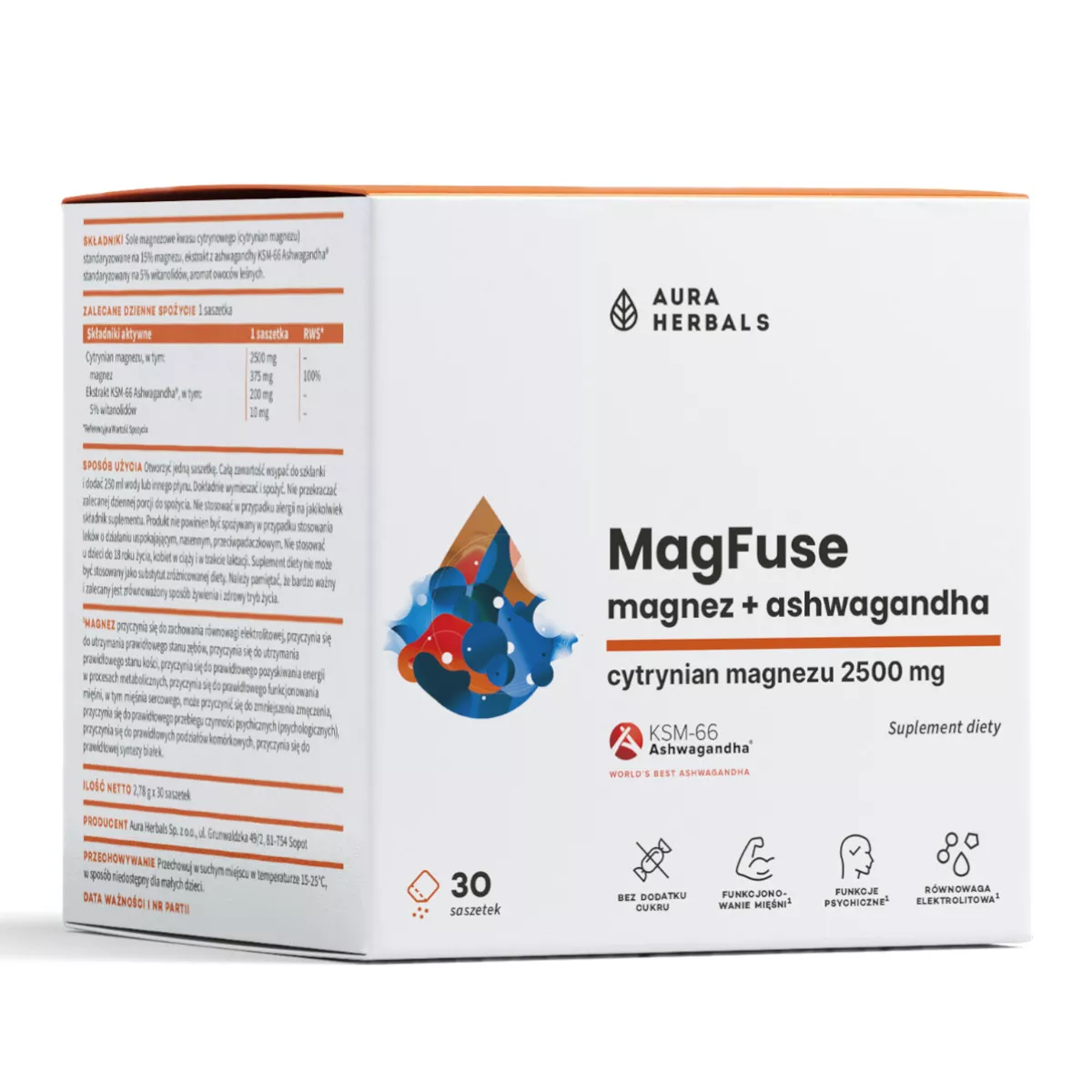 Aura Herbals MagFuse magnez + ashwagandha to innowacyjny suplement diety, który łączy w sobie wysokiej jakości magnez z markowym ekstraktem KSM-66 Ashwagandha®. Produkt dostępny w wygodnych saszetkach, zapewnia pełne pokrycie dziennego zapotrzebowania na magnez oraz wspiera funkcjonowanie mięśni i układu nerwowego.
