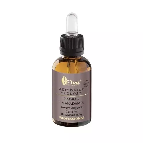 Ava Laboratorium Aktywator Młodości PLUS serum olejowe Baobab i Makadamia 30ml to zaawansowane serum o wielokierunkowym działaniu przeciwzmarszczkowym, stworzone z myślą o intensywnej pielęgnacji skóry. Formuła oparta na organicznym oleju z nasion baobabu, oleju makadamia oraz winogronowym zapewnia 100% odżywienia, doskonałe nawilżenie i widoczną poprawę wyglądu cery. Wzbogacone o witaminę E – znaną jako „witamina młodości” – serum skutecznie wspomaga walkę z oznakami starzenia, wygładza skórę i pomaga zachować jej młody wygląd na dłużej.
