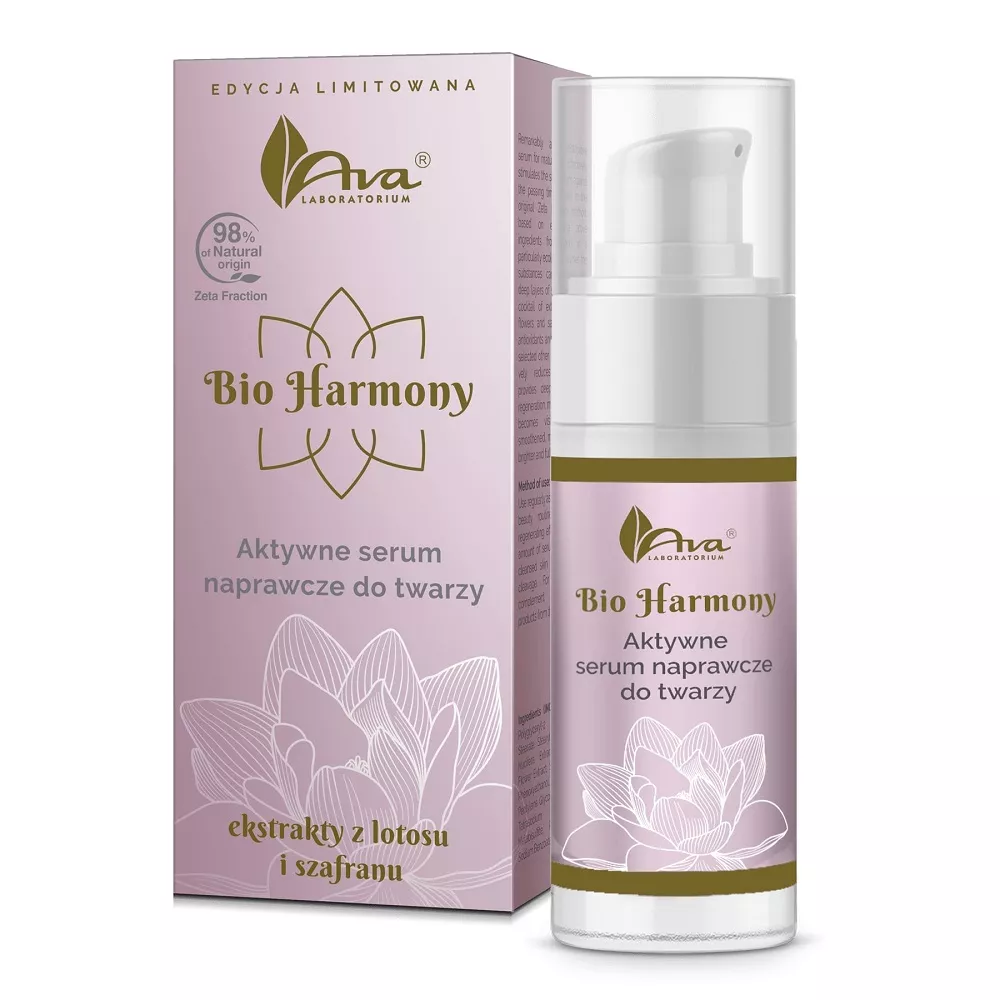 Ava Laboratorium Bio Harmony aktywne serum naprawcze do twarzy 30ml to innowacyjny kosmetyk stworzony z myślą o pielęgnacji cery dojrzałej. Zaawansowana receptura oparta na oryginalnej metodzie Zeta Fraction pozwala pozyskać naturalne składniki aktywne z roślin w sposób wysoce ekologiczny i precyzyjnie dostarczyć je do głębszych warstw skóry. Esencjonalny koktajl z kwiatów lotosu, szafranu oraz antyoksydantów skutecznie stymuluje procesy regeneracyjne, redukuje zmarszczki i intensywnie nawilża, zapewniając skórze młody wygląd, jędrność i blask.