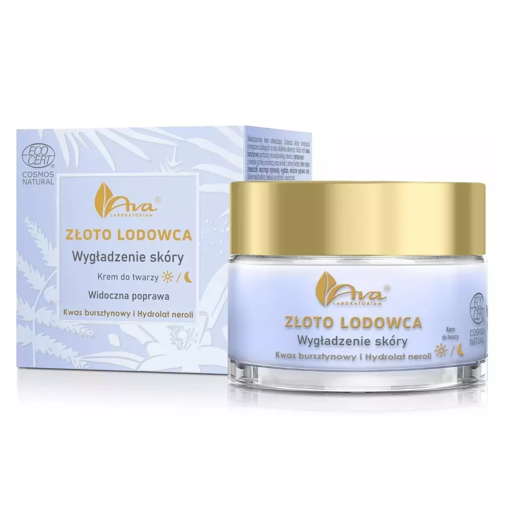 Ava Laboratorium Złoto Lodowca wygładzający krem do twarzy 50ml to zaawansowany, wielozadaniowy krem odmładzający, stworzony z myślą o wymagającej cerze poszukującej intensywnej regeneracji i wygładzenia. Formuła zawiera certyfikowane składniki aktywne, w tym kwas bursztynowy pochodzący z szwajcarskiego lodowca, hydrolat z kwiatów neroli oraz ekstrakt z zielonej herbaty, które synergicznie działają na skórę. Krem skutecznie spłyca zmarszczki, poprawia jędrność i elastyczność oraz zapewnia głębokie nawilżenie, pozostawiając cerę widocznie gładszą i bardziej promienną.