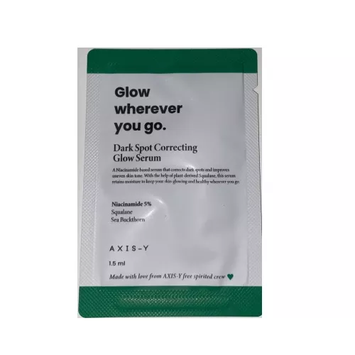 Axis-y Dark Spot Correcting Glow Serum to innowacyjne serum w saszetce 1.5ml, które rozjaśnia i nawilża skórę, zapewniając jej zdrowy blask. Oparte na 5-procentowym niacynamidzie, skutecznie koryguje przebarwienia i wyrównuje koloryt skóry. Dzięki zawartości roślinnego skwalanu, serum wspomaga zatrzymanie wilgoci, nadając skórze zdrowy wygląd.