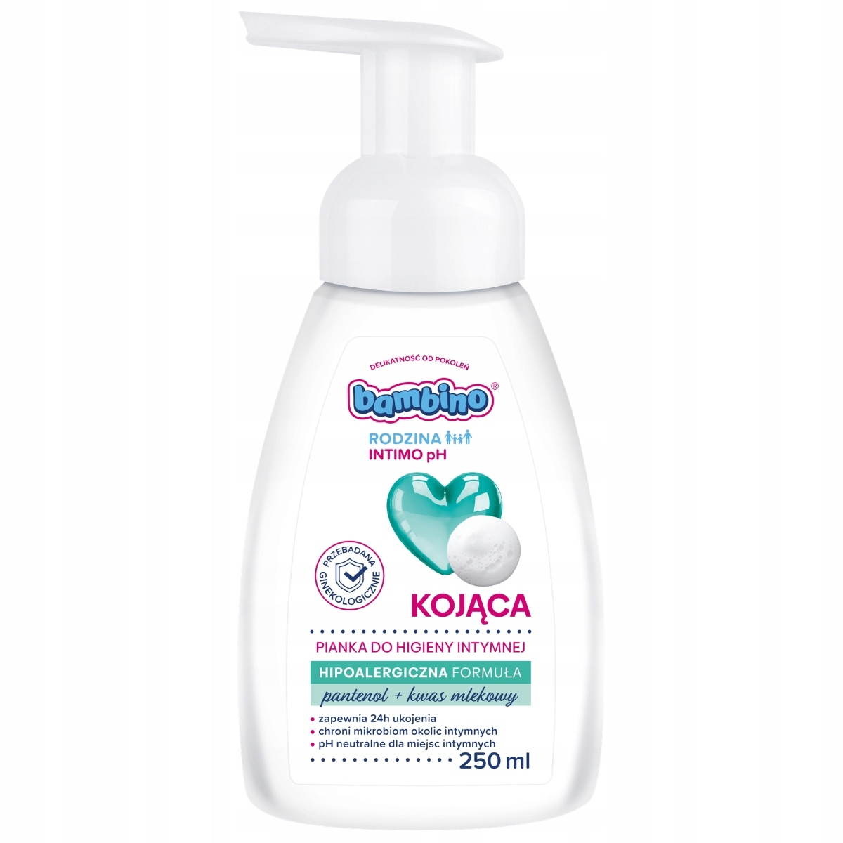 Bambino Rodzina Intimo pH kojąca pianka do higieny intymnej 250ml to wyjątkowo delikatny kosmetyk przeznaczony do codziennej pielęgnacji miejsc intymnych całej rodziny. Dzięki lekkiej, puszystej formule zapewnia przyjemne uczucie świeżości i komfortu, jednocześnie dbając o naturalną równowagę pH skóry. Pianka została opracowana w taki sposób, aby minimalizować ryzyko podrażnień, wspierać naturalny mikrobiom oraz utrzymywać odpowiedni poziom nawilżenia skóry okolic intymnych.