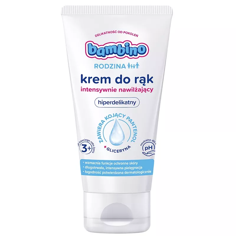 Intensywnie nawilżający krem do rąk Bambino Rodzina to delikatna formuła przeznaczona do stosowania zarówno u dorosłych, jak i dzieci powyżej 3 roku życia. Krem pomaga utrzymać naturalną równowagę hydrolipidową skóry, zapobiegając jej przesuszeniu. Dzięki swojemu składowi pielęgnuje skórę i zapewnia jej długotrwałe nawilżenie.