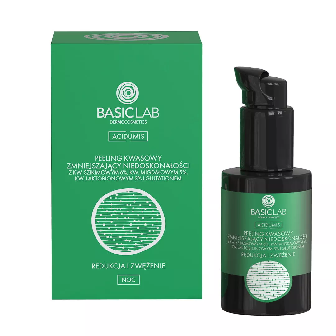BasicLab Acidumis to zaawansowany peeling kwasowy, który efektywnie redukuje niedoskonałości skóry dzięki połączeniu 6% kwasu szikimowego, 5% kwasu migdałowego i 3% kwasu laktobionowego. Wzbogacony o silne antyoksydanty, jak glutation i resweratrol, wspomaga odnowę i regenerację skóry, oczyszcza pory oraz niweluje przebarwienia.